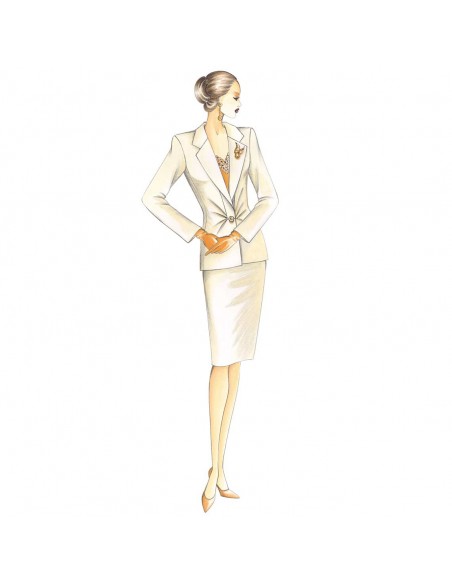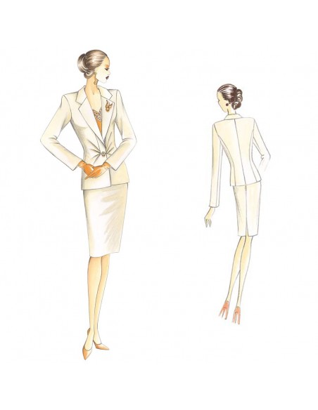 Elegante giacca a monopetto con revers diviso dal corpetto che ferma le pieghe lasciate morbide, da realizzare in crêpe di lana o satin.