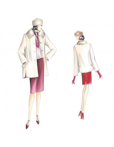 Giaccone monopetto di linea diritta con tagli stondati che terminano sul fianco siglati da listello e tasche interne inserite, spacchi laterali e collo guarnito in astrakan. Realizzabile in panno o velour.