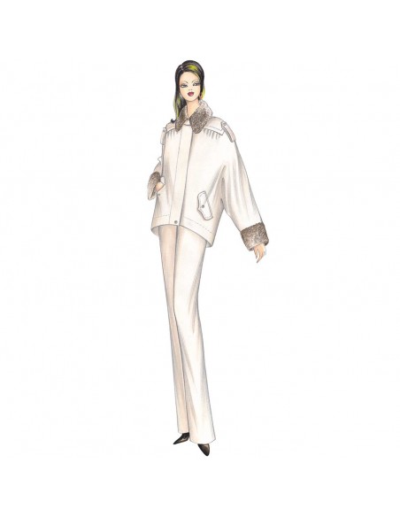 Giaccone dalla linea ad uovo con chiusura nascosta, carrè che trattiene una leggera arricciatura, maniche a kimono con polsi in astrakan come il collo, fondo che scende leggermente sul dietro. Realizzabile in suede o tessuto spalmato con imbottitura interna, vigogna.