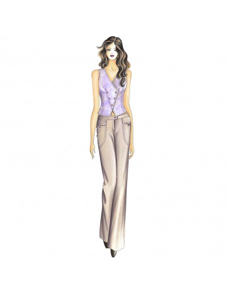 Gilet modellato con allacciatura a doppio incrocio obliquo che diventa monopetto e si apre in spacchetto al fondo. Realizzabile in denim, fresco di lana, crêpe. Blusa n. 1483. Pantaloni n. 1484.