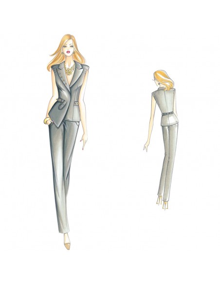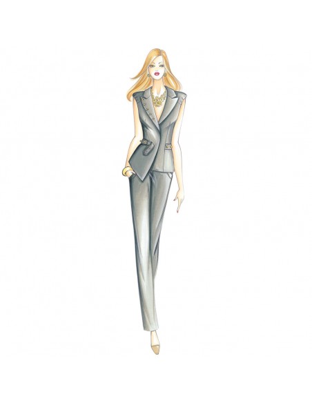 Gilet a doppo incrocio tagliato diagonalmente creando punta al fondo con cintura a listello in vita, collo dai revers a lancia di cui uno percorso da bottoncini e spalle imbottite. Realizzabile in denim, gabardine, fresco di lana, ecopelle. Gonna n. 2509.