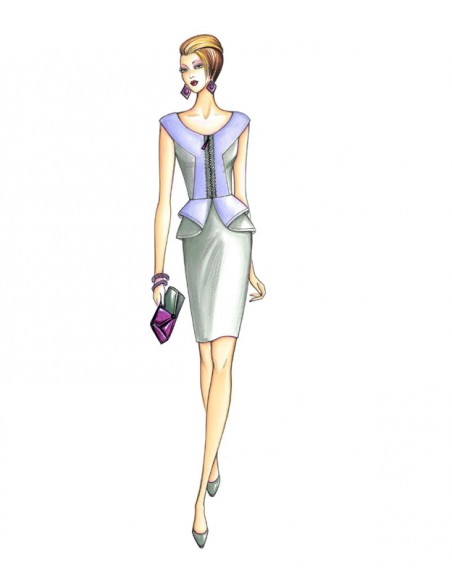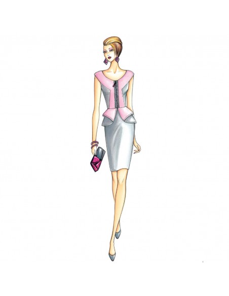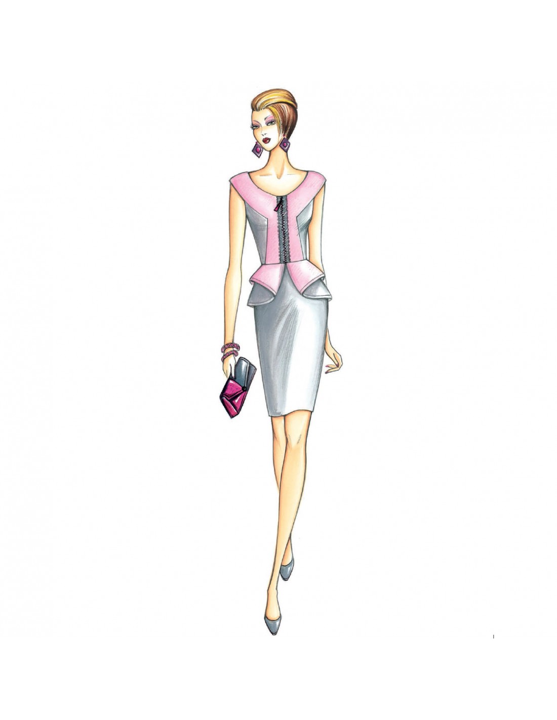 Raffinato gilet con corpino attillato chiuso da zip e baschina ribattuta leggermente scostata. Realizzabile in faille, mikado, gazar o piquet.
