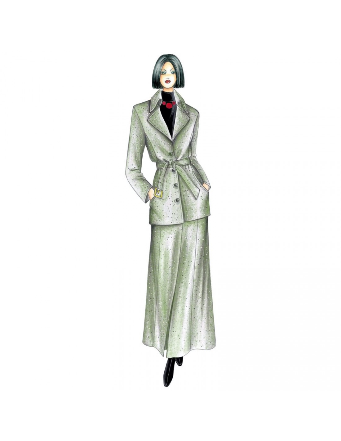 Gonna longuette con alto spacco centrale, apertura con zip posta obliqua. Giacca n. 7042.