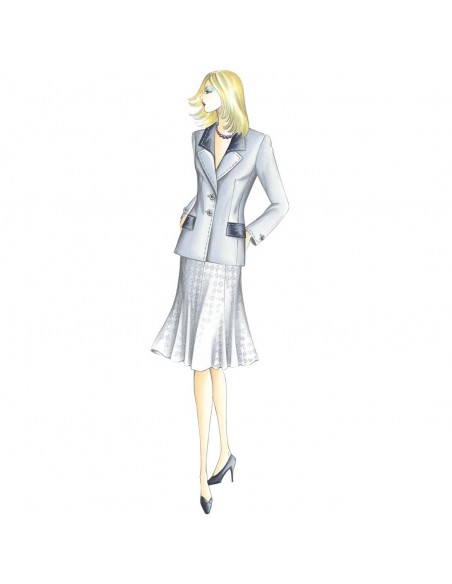 Gonna a otto teli svasati al fondo con baschina in sbieco chiusa lateralmente da bottoni a pressione. Giacca n. 1044.
