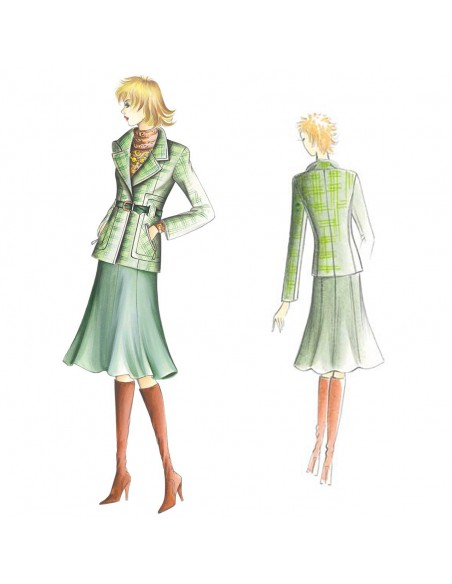 Gonna leggermente a bassa vita divisa in otto teli in sbieco che si aprono al fondo. Giacca n. 1061.