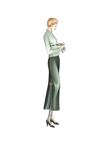 Dettagli retrò per la gonna longuette di linea diritta con passamaneria dorata che percorre il fianco e termina ad alamaro sullo spacco con doppia piega. Realizzabile in velluto liscio, vigogna, fresco di lana.
