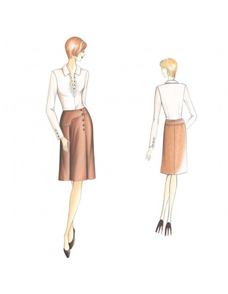 Gonna svasata con baschina sagomata, apertura laterale chiusa da bottoni in corrispondenza di una delle due pieghe. Giacca n. 1099.