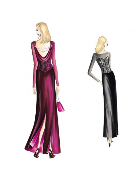 Gonna lunga realizzabile in velluto o crêpe di seta, linea diritta divisa in teli con spacchi sul dietro e fodera colorata in raso. Bustier n. 1542.