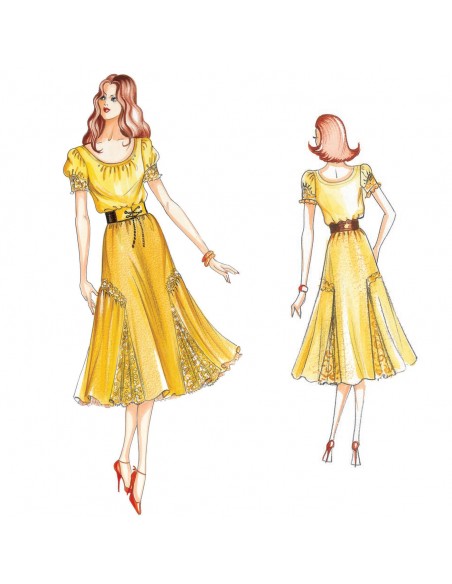 Gonna morbida al punto vita, volants in tessuto sbieco con lieve arricciatura, spicchi in pizzo di cotone, cintura in elastico con allacciatura a stringa. Blusa n. 1841.