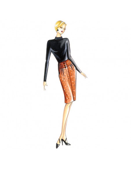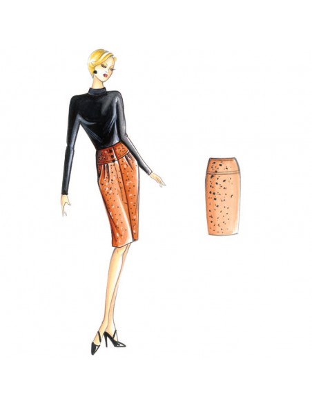 Gonna a tubino con baschina e tasche alla francese, allacciatura con bottoni e zip nascosta.