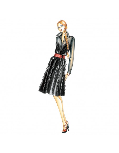 Gonna di linea svasata con volants inseriti verticalmente. Tessuto consigliabile organza o chiffon.