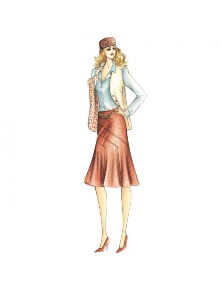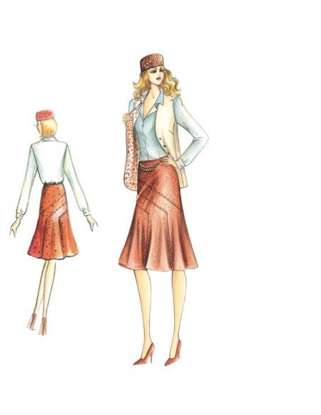 Gonna modellata a sei teli tagliati diagonalmente che si aprono al fondo donando ampiezza. Realizzabile in tweed, crêpe, denim. Gilet n. 5193.