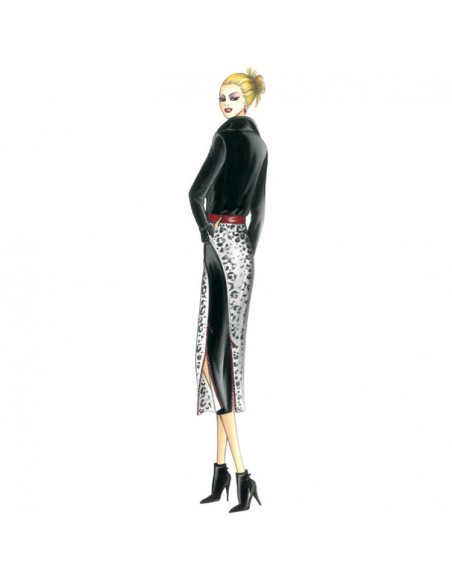 Gonna longuette con originale telo che dal davanti prosegue nel dorso con spacchi e zip.
