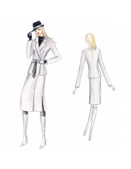 Gonna di linea diritta con fascione a bassa vita, spacco sovrapposto laterale e spacchi accostati ai fianchi. Giacca n. 8483.