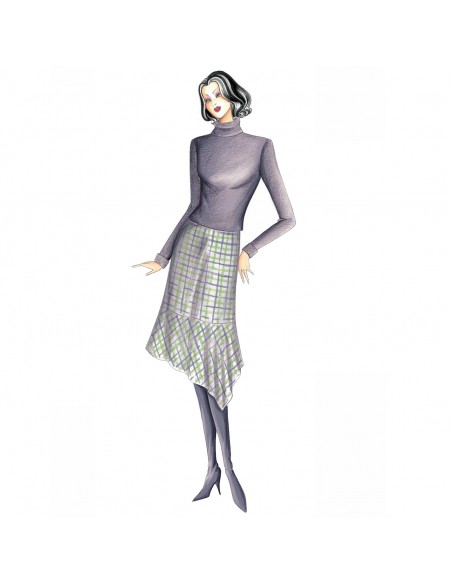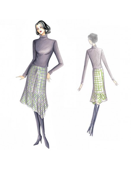 Gonna di linea svasata con volant al fondo in sbieco che scende a punta lateralmente. Realizzabile in tessuto scozzese, grisaglia, crêpe, satin o chiffon.