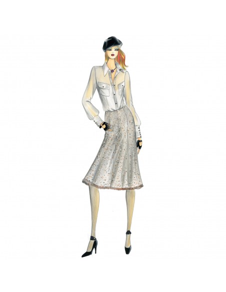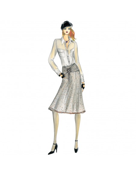 Gonna a otto teli sfilacciata all’orlo, cintura in tessuto come la gonna con stringa in pelle. Blusa n. 9270.