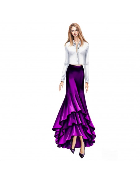 Gonna lunga resa ampia al fondo da tre volants degradanti sul davanti che si allungano sul dietro. Realizzabile in taffetas o raso. Camicia n. 8096.
