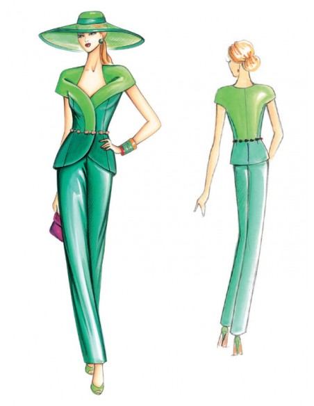 Linee scultoree per la giacchina di linea modellata con pences sulla scollatura a cuore e tagli ad arco che dal kimoncino scendono fino al punto vita, enfatizzati se si realizza la giacca in tessuti contrastanti. Consigliabile in gazar, doppio raso od organza tripla.