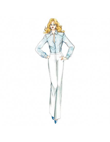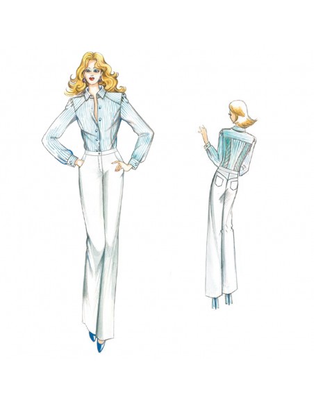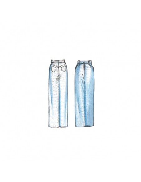 Pantalone con motivo a jeans di linea diritta, realizzabile in denim, lino, cotone elasticizzato.