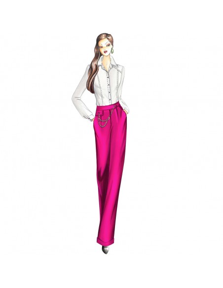 Pantalone maschile di linea diritta con risvolto al fondo, tasche alla francese, pinces con pattina singola. Realizzabile in sallia, fresco di lana, tweed, gessato. Cappotto n. 6626. Camicia n. 1077.