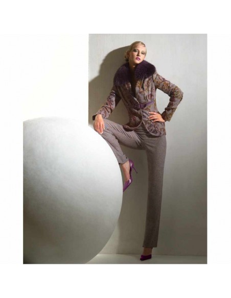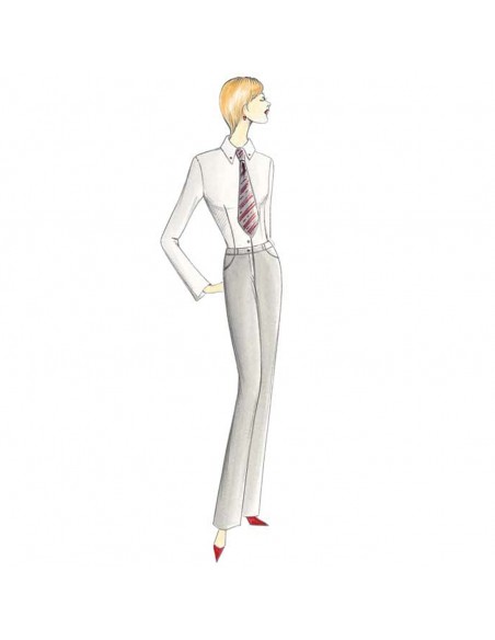 Pantaloni di linea diritta con fascioncino inserito e tasche alla francese. Giacca n. 1052, 1057 e 1059.