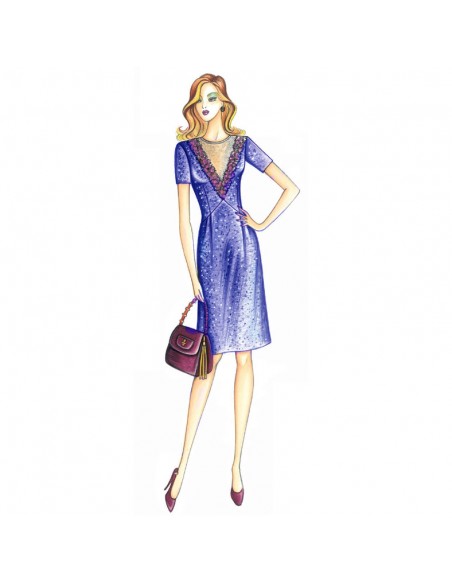 Abito da realizzare in tweed o altro tessuto maschile con corpetto dalla profonda scollatura a V guarnita da organza o chiffon e bordo in pizzo di lana o macramé, gonna leggermente svasata e punto vita con pinces morbide.