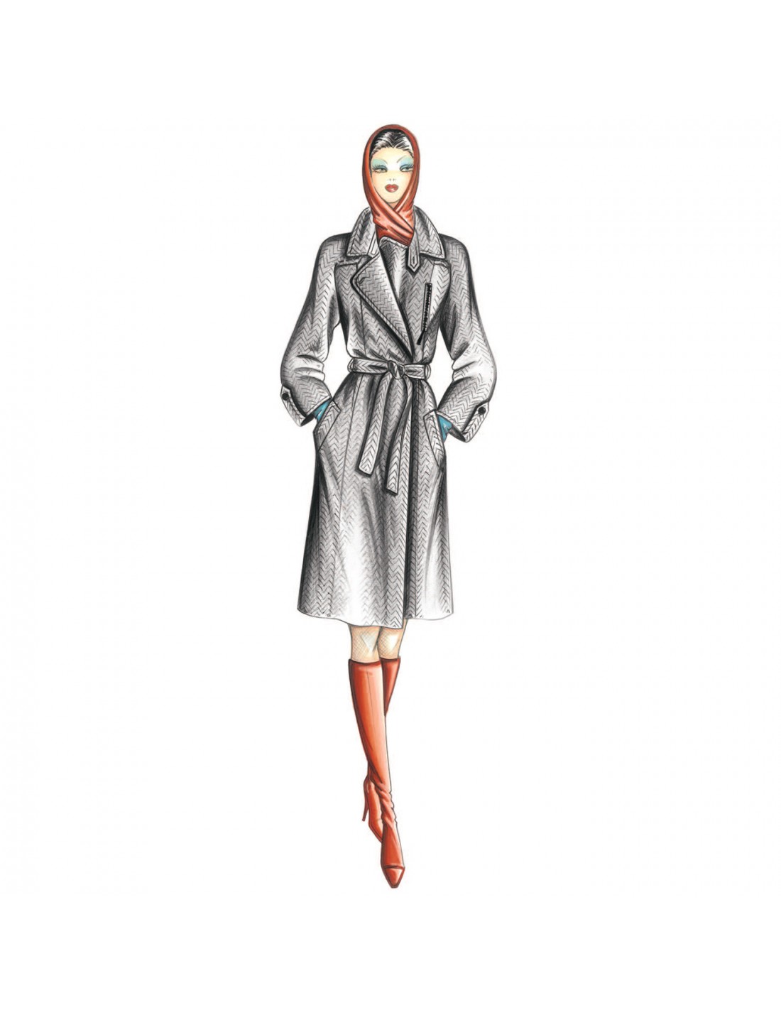 Cappotto stile trench a doppiopetto con maniche intere allo sprone, collo a camicia con listello fermato da un bottone, tasche interne e taschino fermato da zip.