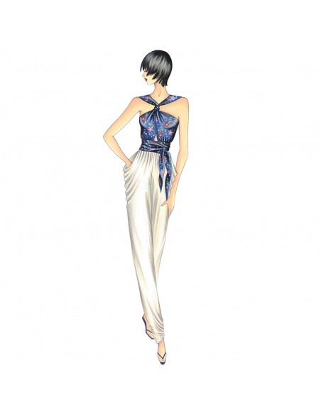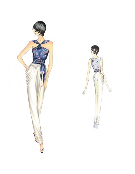 Top con fusciacca in vita che ferma due pannelli a doppio torciglione nella scollatura. Consigliabile in jersey. Pantalone n. 2216.