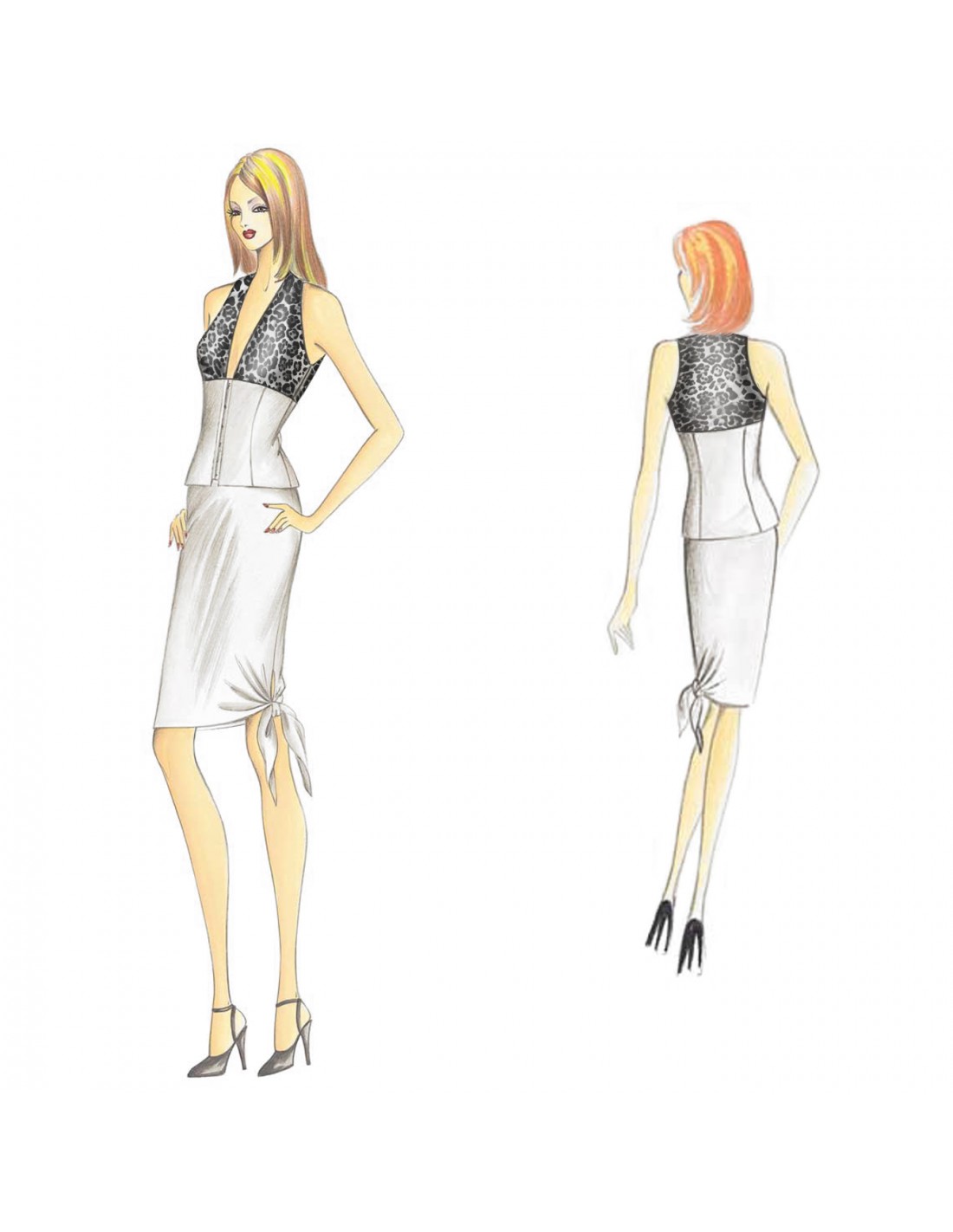 Top a giro rientrante con parte superiore in chiffon o jersey mossa da leggero drappeggio e alto fascioncino ad effetto corsetto chiuso da ganci realizzabile in crêpe-satin o denim stretch. Gonna n. 9448.