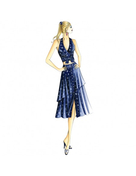 Top da realizzare in tessuto provenzale o mussola doppiata con motivo di fascioncino incrociato. Gonna n. 9894.