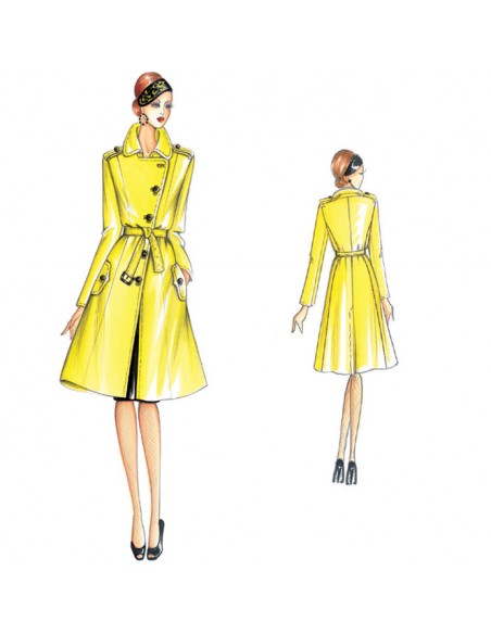 Trench consigliato in gabardine con allacciatura a doppio incrocio solo nel corpetto e che scende diagonalmente diventando monopetto, listelli sulle spalle, tasche interne e pattine sagomate fermate da bottone.