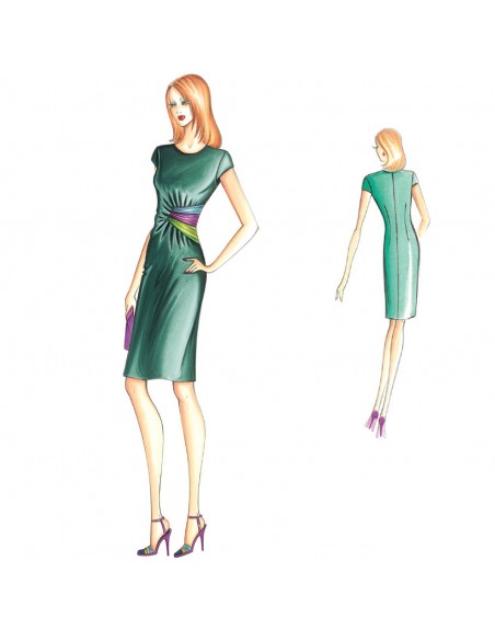 Abito tubino drappeggiato consigliabile in crêpe, jersey o velluto con bande in raso in tre colori con diverse tonalità, maniche a giro molto corte.