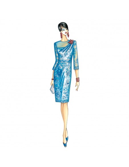 Tubino di linea semi-modellata con monospalla drappeggiata e siglata da spilla. Tessuti consigliati: crêpe, raso jacquard o jersey. Realizzabile con o senza le maniche ed il carrè in chiffon.