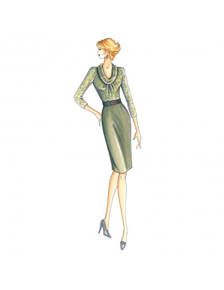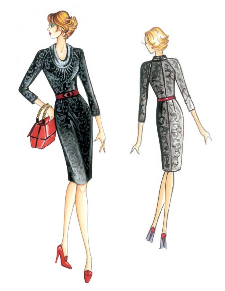 Tubino da realizzare in jersey o crêpe, corpetto con maniche raglan a ¾, collo ad anello che trattiene l’arricciatura e punto vita segnato da cintura.