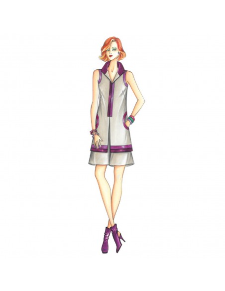Long, flared sleeveless tunic with polo neck, central split and rounded internal pockets. Can be made in cotton or piqué with contrasting colour grosgrain edging.